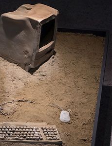 The earth and its geological strata provides the affordances for technical media to operate, 4 but it also offers the ground for the ending point for the remains of today’s ephemeral and disposable digital culture. As Parikka and Hertz have noted “media never die but remain as toxic waste residue.” 5 They constitute a “natural history of electronics” as Gabrys has put it, 6 a term that Rosemary Lee also turns to, while referring to her work Molten Media which is hosted in the show. Molten Media (2013-2018) discusses the material side of apparatuses which litter the earth, forming mountains of e-waste. Featuring the decay of an old Macintosh computer, the work exposes the side that is usually left unseen when it comes to the immaterial culture of connectivity, which is also a throwaway culture. Rosemary Lee as well as Benjamin Gaulon with his work Broken Portraits (2017-ongoing) underlines the problem of planned obsolescence; this is the capitalist logic of manufacturing devices that are purposed to become obsolete after a certain period of time, of building machines that are made to break with systems not easy to run, of introducing a design that will soon be considered unfashionable and replaced by the next generation. Gaulon presents a series of broken screens magnified and reproduced with plexiglass, pointing to the aesthetics and futility of planned obsolescence.